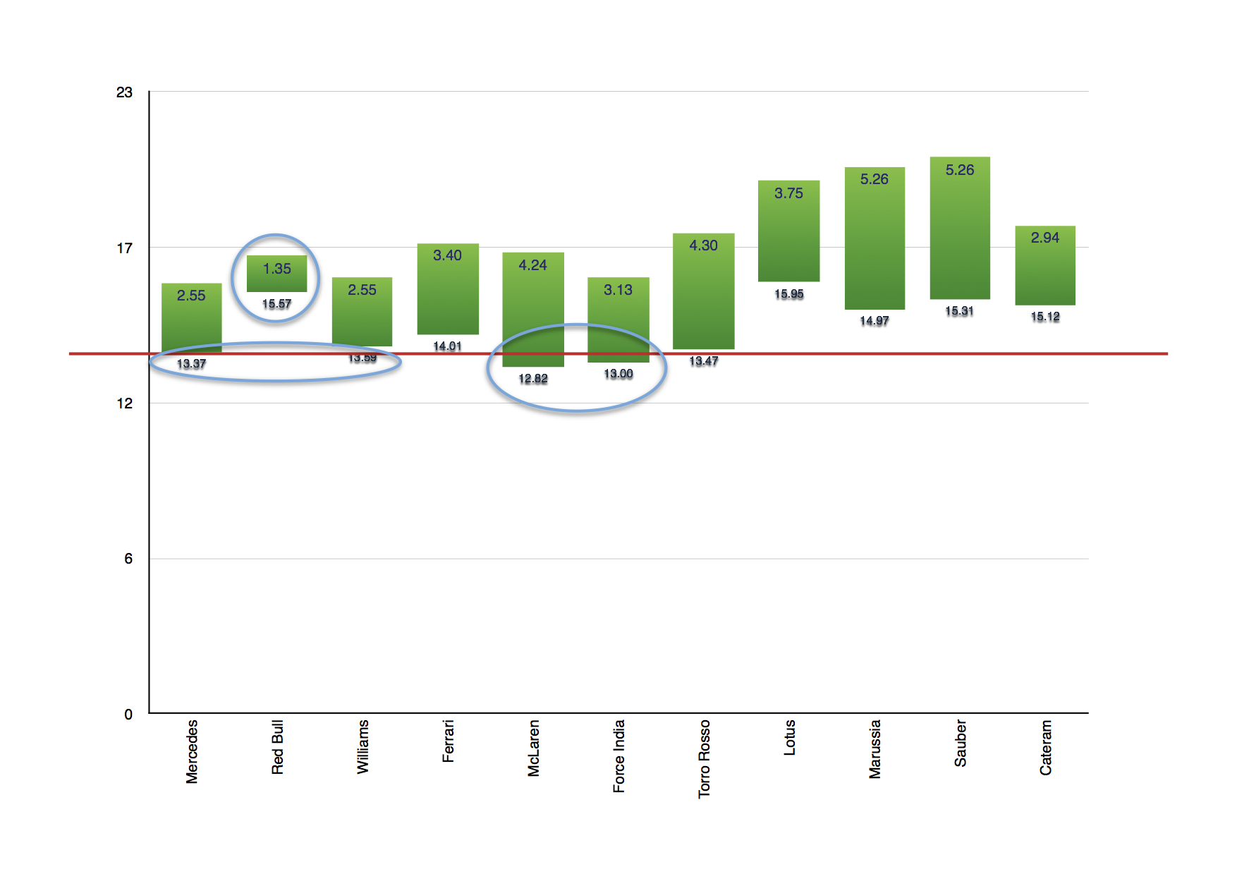 - Mercedes and Williams had the same impressive (not as small as Red Bull) spread, but Mercedes just edged ahead of Williams. This just does not feel right. It makes William’s result all the more impressive and the Mercedes result can only be due to the odd team behaviour through the season. It is all credit to Toto Wolf and Nikki Lauder that it was not worse.